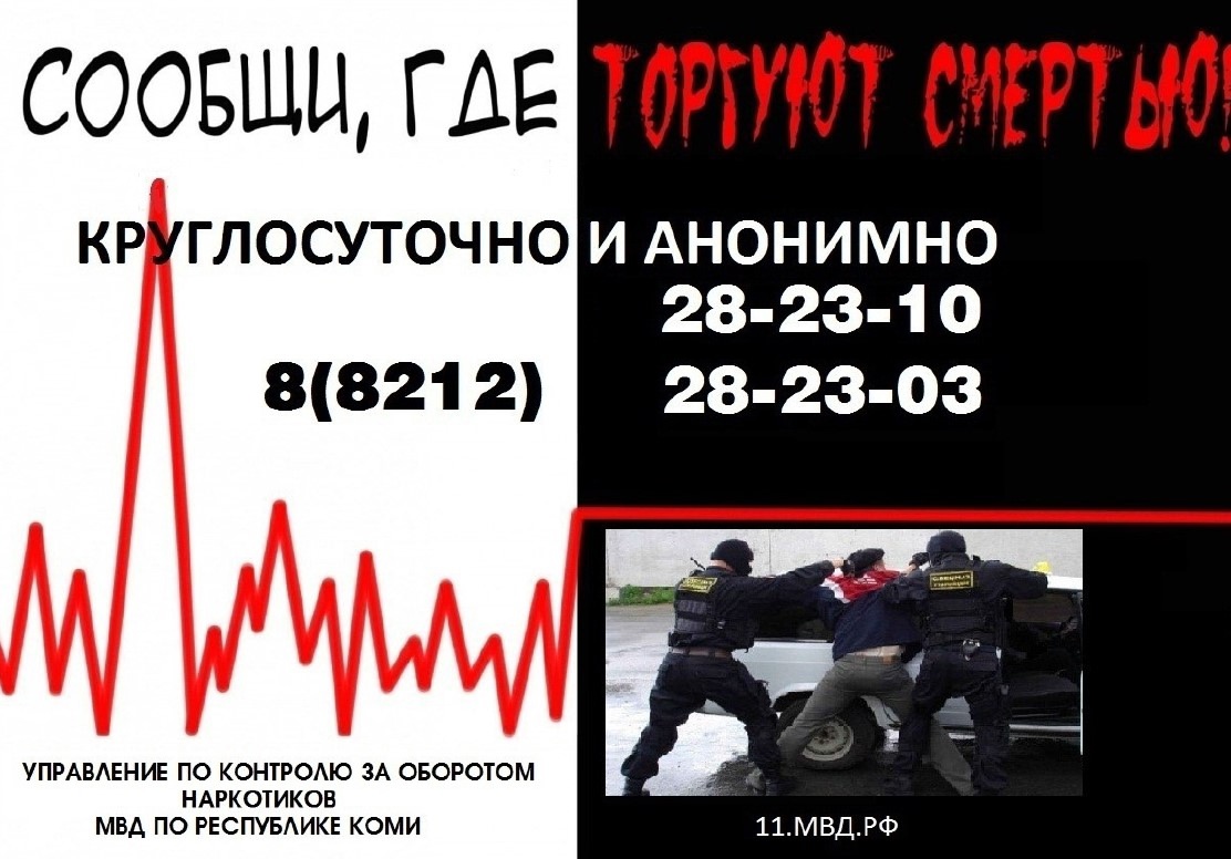 Сообщить о фактах незаконного оборота наркотиков можно по телефонам Управления по контролю за оборотом наркотиков МВД по Республике Коми: 8 (8212) 28-23-10, 28-23-03. Конфиденциальность информации гарантируется.