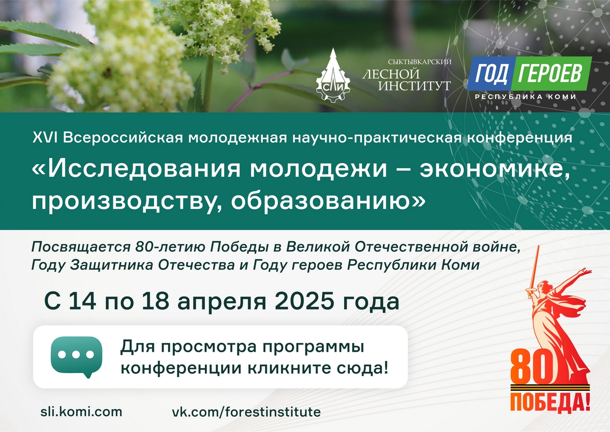 Конференция состоится 14-18 апреля 2025 года на площадке Сыктывкарского лесного института (г. Сыктывкар, Республика Коми). Для участия в конференции приглашаются молодые исследователи: школьники и студенты, учащиеся вузов и сузов, магистранты и аспиранты в возрасте до 35 лет.