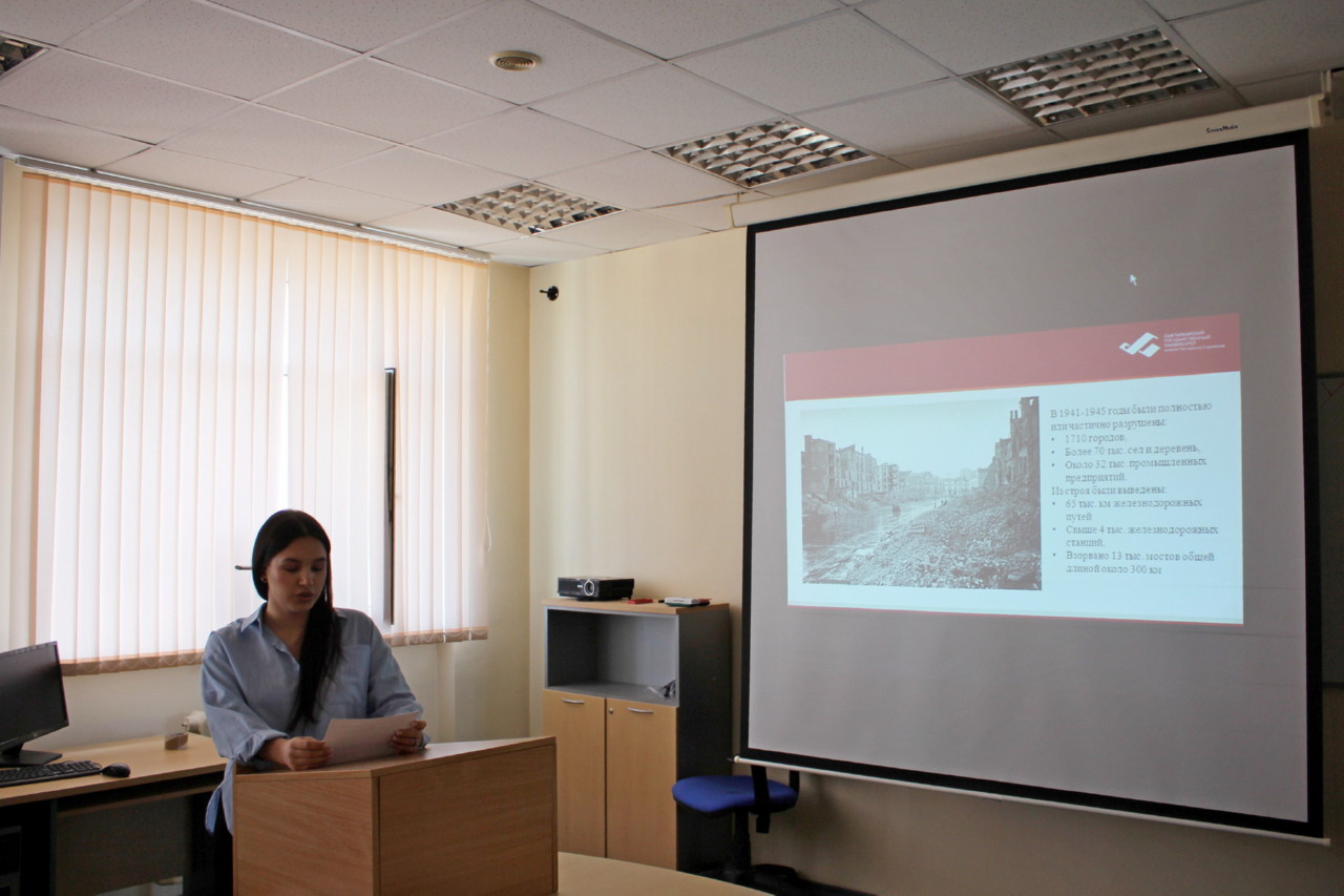 Молодые исследователи направлений подготовки «Строительство», «Технология лесозаготовительных и деревоперерабатывающих производств» и «Лесное дело» представили интересные научные доклады. Особое внимание было уделено работе армейских дорожников в годы войны, состоянию железнодорожной инфраструктуры и ее восстановлению после разрушений. Отдельно был рассмотрен вклад лесной отрасли в обеспечение армии и производство вооружения.
