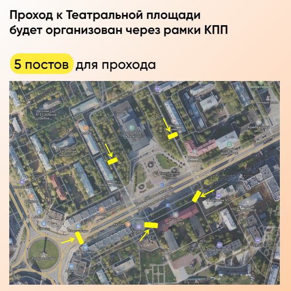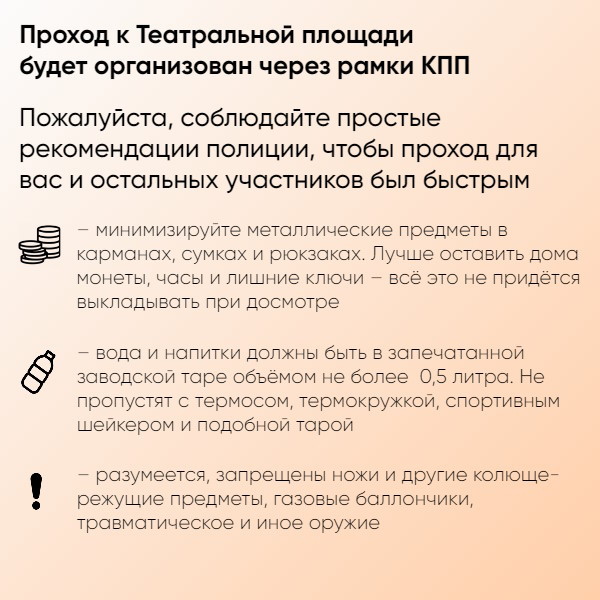 В целях безопасности участников акции проход к Театральной площади будет организован через рамки КПП. Пожалуйста, соблюдайте простые рекомендации полиции, чтобы проход для вас и остальных участников был быстрым: