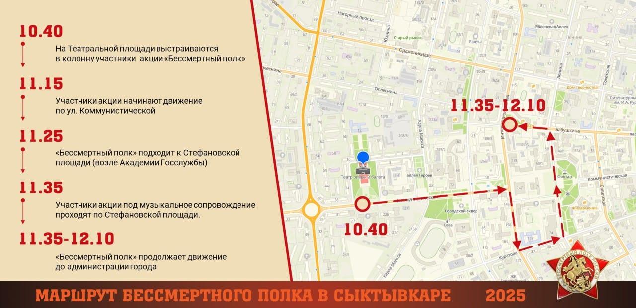 9 мая после долгого перерыва в столице Республики Коми вновь состоится шествие народной акции «Бессмертный полк». Сбор горожан и формирование колонн участников шествия «Бессмертный полк» начнется в 10:40 у Театральной площади.