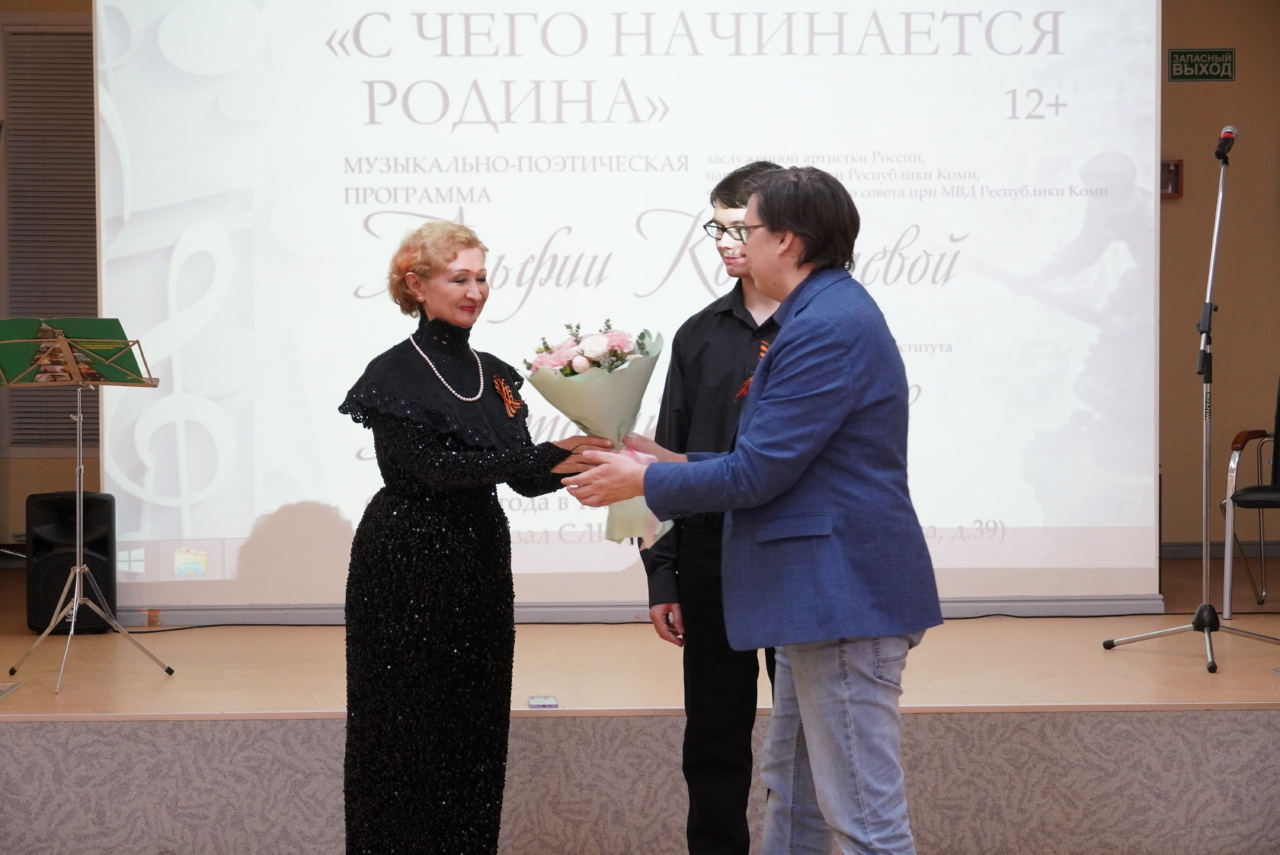 Главным гостем концертной программы стала заслуженная артистка России, народная артистка Республики Коми, член Общественного совета при МВД по Республике Коми Альфия Коротаева. Ее душевное исполнение песен военных и советских лет стало настоящим украшением зала. Ведущим программы выступил студент второго курса СЛИ, сын Альфии Коротаевой, Анатолий Иевлев. Своей искренностью он сумел создать теплую атмосферу, объединившую всех присутствующих.