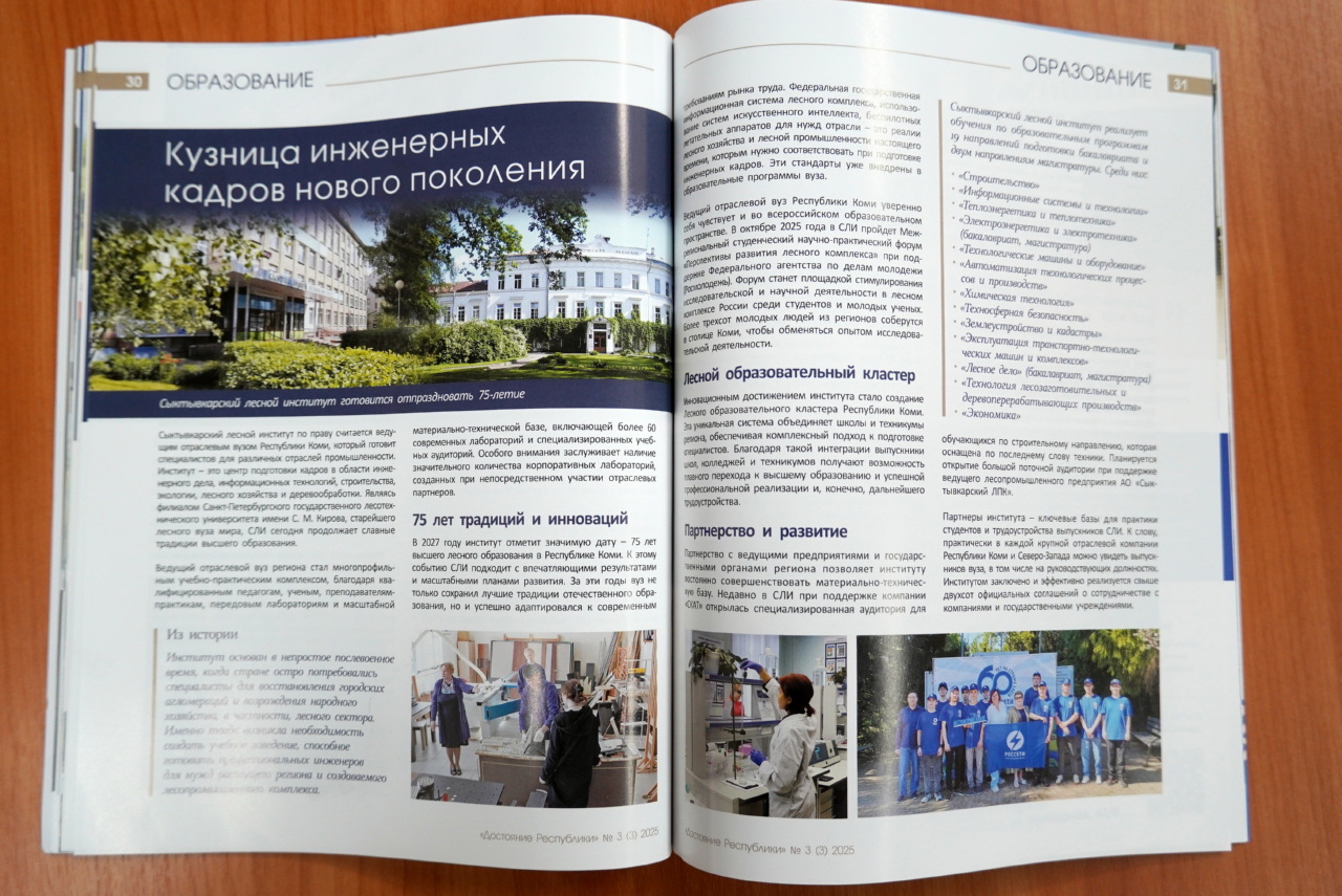 Деловой журнал «Достояние Республики» представляет эксклюзивный материал о ведущей отраслевом вузе Республики Коми – Сыктывкарском лесном институте. В свежем выпуске издания читатели смогут познакомиться с историей и достижениями учебного заведения, которому в 2027 году исполнится 75 лет.