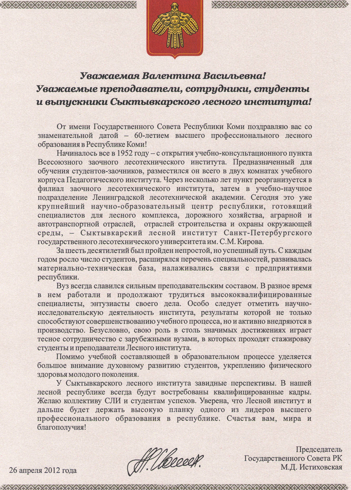 От имени Государственного Совета Республики Коми поздравляю вас со знаменательной датой — 60-летием высшего профессионального лесного образования в Республике Коми!