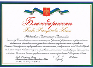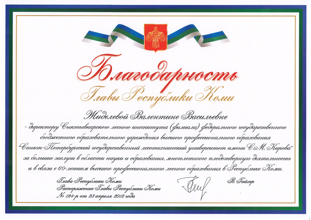 Благодарность Главы РК Жиделевой Валентине Васильевне — директору Сыктывкарского лесного института.