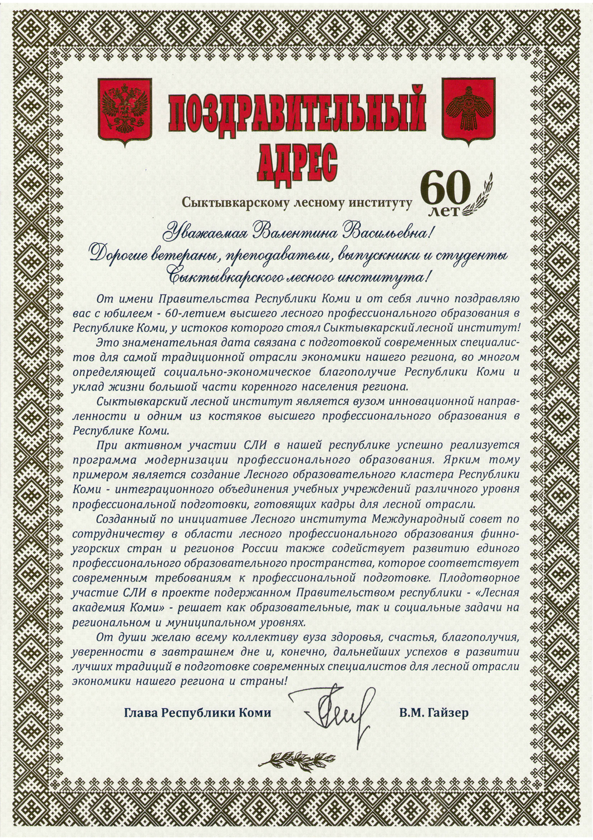 От имени Правительства Республики Коми и от себя лично поздравляю вас с юбилеем — 60-летием высшего лесного профессионального образования в РК, у истоков которого стоял Сыктывкарский лесной институт!